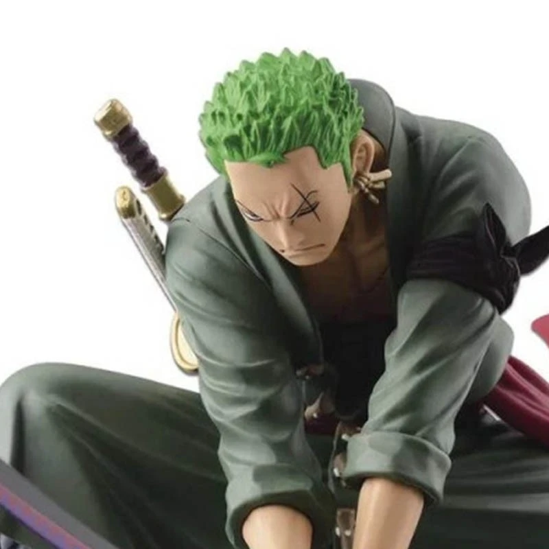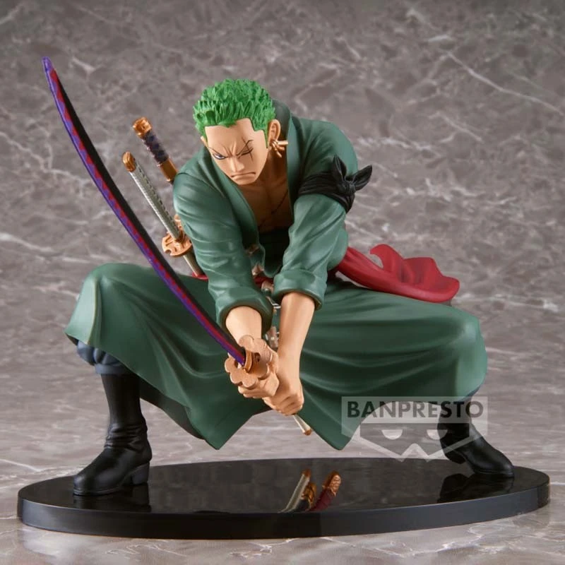 One Piece Figurine Roronoa Zoro dans la gamme SCultures du fabricant Bandai Banpresto. Figurine One Piece en PVC, taille : 13 cm de Zoro dans une pose dynamique.